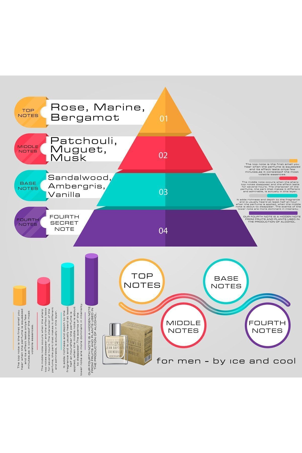 Brezilya sahillerinde samba ritimleri, loş ışıkta turuncu ve mavi patlamalar, çarpışan dalgaların enerjisi ve kahkahaların coşkusu… Jean Baptiste Grenouille Ice and Cool, tam da bu atmosferi teninize taşıyan özel bir erkek parfümüdür. İlk sıkıldığında bergamot, gül ve deniz notalarının ferahlatıcı açılışı sizi canlandırır. Ardından paçuli, müge ve miskin çekici kalbiyle birleşir. Finalde sandal ağacı, ambergris, vanilya ve miskin büyüleyici uyumu devreye girer. Sonuç: hiçbir kadının karşı koyamayacağı kadar güçlü, sıcak ve çekici bir imza.
