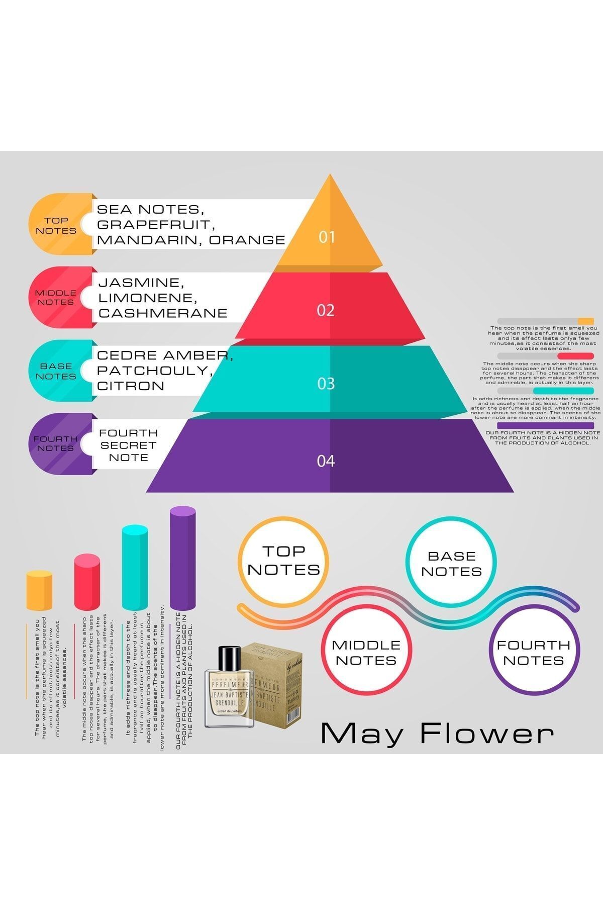 Her JBG parfümünde olduğu gibi, May Flower da yıllar süren AR-GE çalışmalarıyla geliştirilen niş esansiyel yağlardan oluşur. %30-40 esans oranı sayesinde tende 12 saat, kıyafetlerde 48 saate kadar kalıcıdır. Şişelenmeden önce 90 gün boyunca meşe fıçılarda dinlendirilir; bu özel süreç kokuların derinliğini artırır. JBG parfümlerini farklı kılan ise dünyadaki diğer parfümlerden ayrı olarak 4 notaya sahip olmasıdır. Bunun sebebi, kullanılan alkolün dahi markanın kendi üretimi olmasıdır.