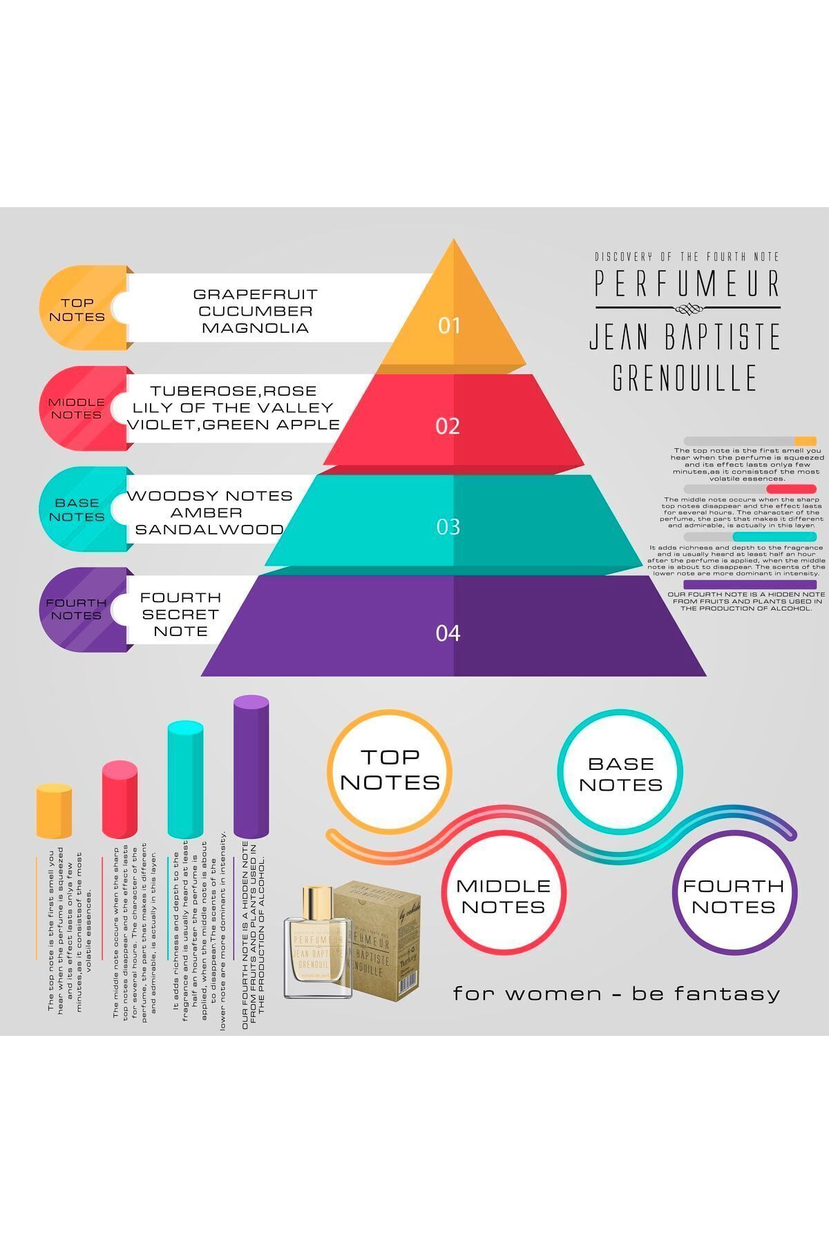 Hayal gücünüzü harekete geçirecek büyüleyici bir koku… Jean Baptiste Grenouille Be Fantasy, tatlı, taze ve keskin greyfurtun enerjik açılışıyla başlar. Salatalığın ekşi-mayhoş dokusu ve ballı kavunun serin tazeliğiyle birleşir. Bu ferah karışım, menekşe ipuçlarıyla yeşil ve derin bir tona kavuşur. Orta notalarda sümbülteber, gül, vadi zambağı ve menekşe, mayhoş yeşil elmayla harmanlanarak sizi bir cennet bahçesine taşır. Alt notalarda sandal ağacı, amber ve odunsu akorlarla parfüm, huzurlu bir ormanda yürüyüş hissi uyandırır.