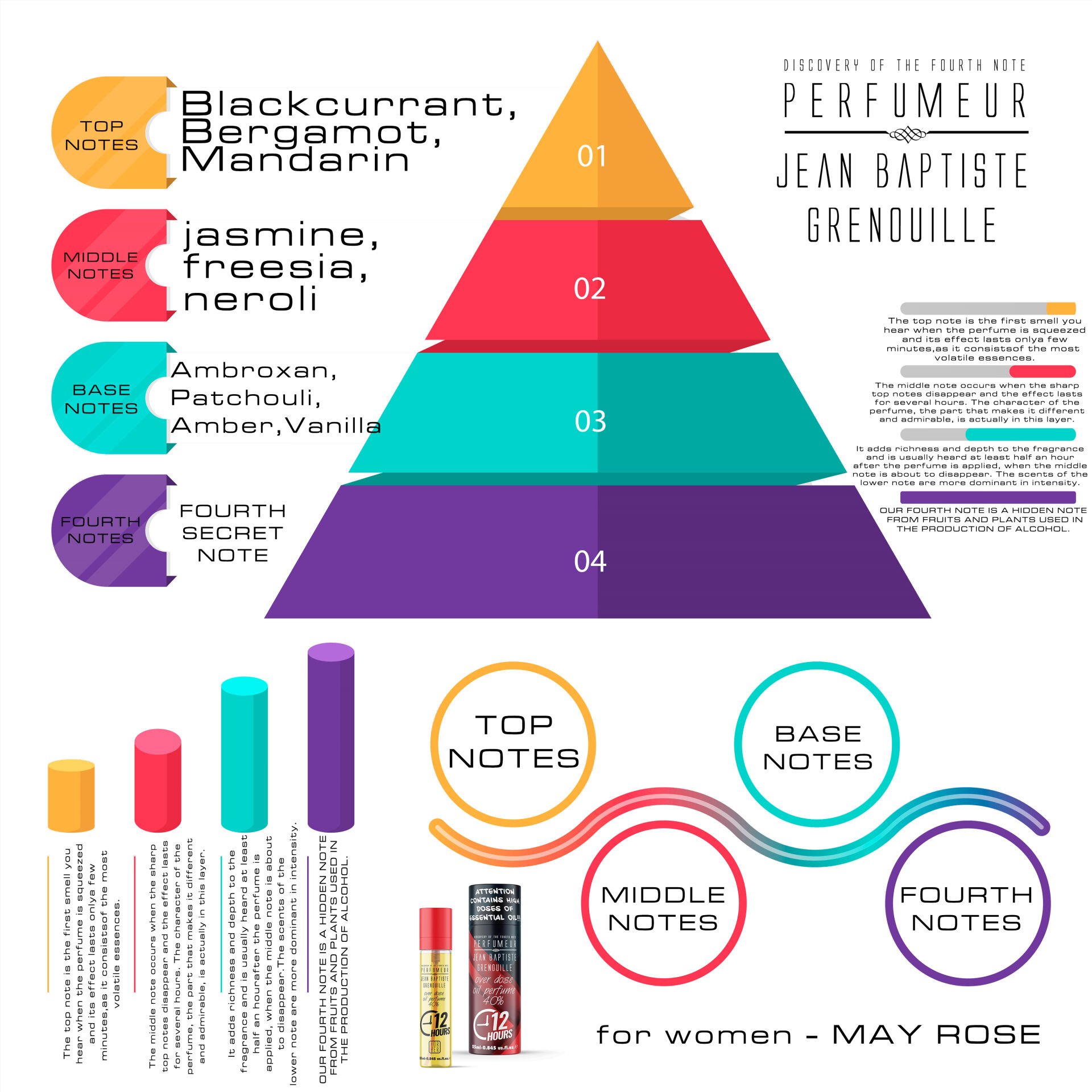 May Rose, feminenliğin en saf ve romantik halini yakalayan eşsiz bir kadın parfümü. Yoğun ama asla ağır gelmeyen yapısıyla, hem özgün hem de iz bırakan bir koku deneyimi sunar. İlk sıkıldığında frenk üzümü nektarının tatlı meyvemsi havası, bergamot ve mandalinanın canlı tazeliğiyle birleşerek enerjik bir açılış yapar. Kalp notasındaki frezya, neroli ve yasemin, zarif bir çiçek bahçesini andırırken, alt notalarda paçuli, odunsu tonlar, amber, vanilya ve ambroksan kalıcı ve baştan çıkarıcı bir iz bırakır.