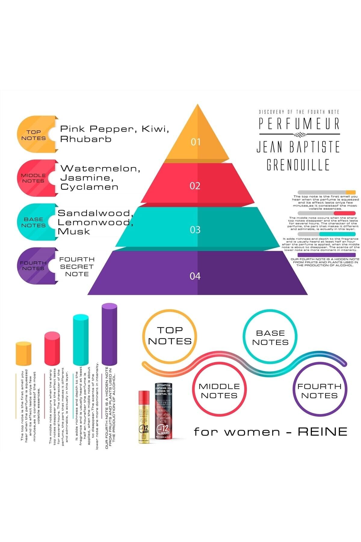 Reine, bir parfümden çok daha fazlası… Adeta sinematik bir sahne gibi büyüleyici ve dikkat çekici. İlk sıkıldığında pembe biberin keskin ve baharatlı enerjisi, kivi meyvesinin tropik, tatlı-ekşi tazeliğiyle buluşuyor. Ravent bitkisinin gizemli ve yeşil dokunuşu ise bu açılışı derinleştirerek sizi bambaşka diyarlara taşıyor. Bu kombinasyon, sıradanlıktan sıyrılıp hayallerinizi renklendiren bir kapı aralıyor.