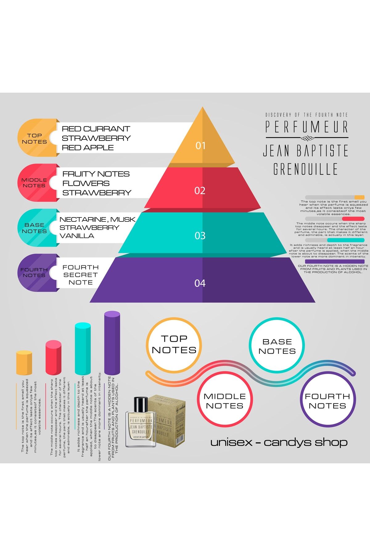 Candys Shop, adeta bir şeker dükkânında dolaşır gibi hissettirir. Bahar çiçeklerinin açmasıyla birlikte gelen taze kırmızı meyvelerin tatlı kokusu, gün boyu enerjinizi yükseltir. Hem kadınlar hem erkekler için tasarlanmış unisex yapısıyla, günün her saatine uyum sağlayan tatlı ve modern bir imzadır.