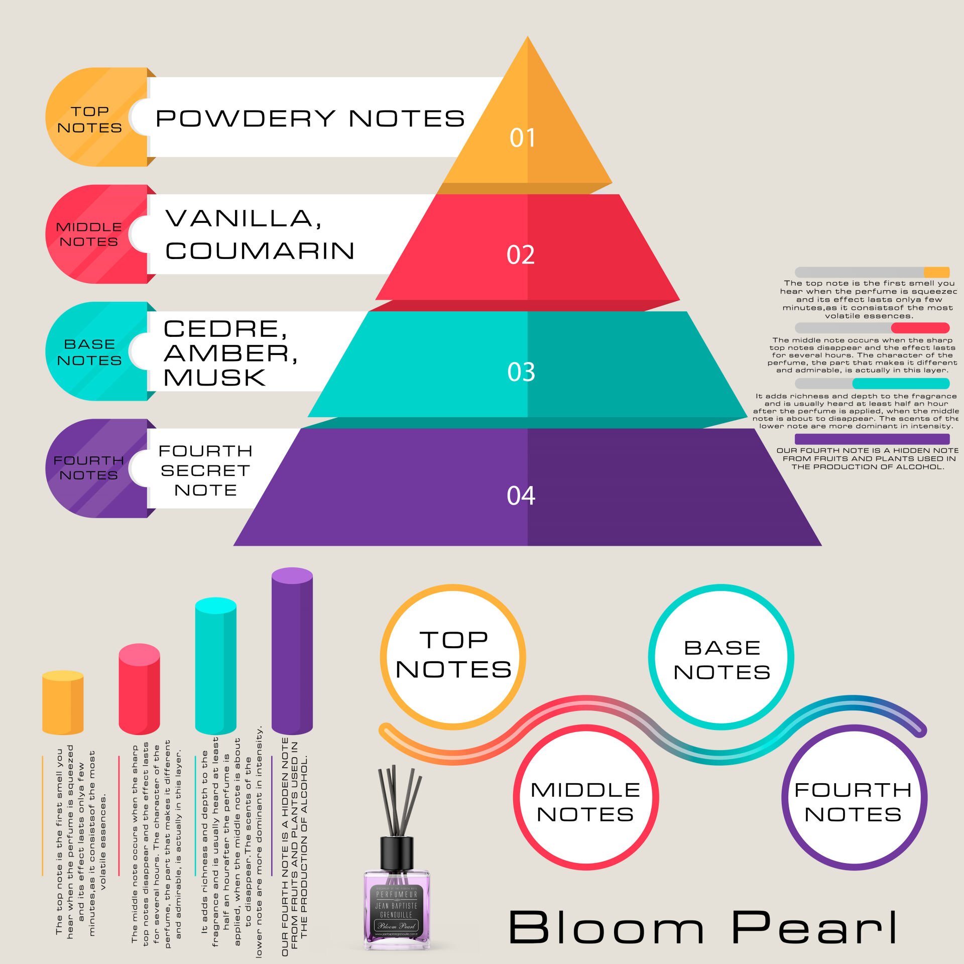 Bloom Pearl, göksel bir yumuşaklık ve zarafetin simgesidir. İlk anda pudralı notalar tatlı miskle birleşerek duyularınızı sarar. Vanilyanın kadınsı dokunuşları ve sedir amberin ferah odunsu tonu ile desteklenerek uzun süre kalıcı, zarif ve huzurlu bir etki bırakır. Ortamda sofistike ve büyüleyici bir atmosfer yaratır.